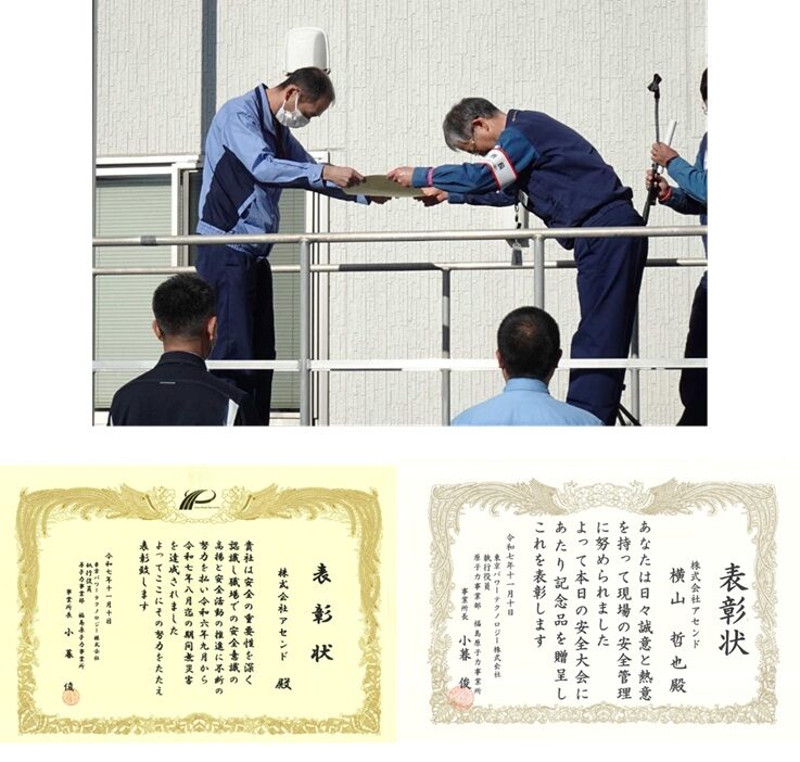 11月10日(月)東京パワーテクノロジー株式会社の安全大会において、福島事業所は令和6年9月から令和7年8月までの1年間、無災害達成により表彰されました。更に分析二課の横山課長が現場の安全管理に努めた功績により、優秀作業班長として表彰されました。